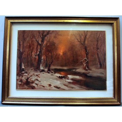 "Paesaggio invernale". Olio su compensato. Firmato in basso a sinistra. In cornice (cm 60x90)
