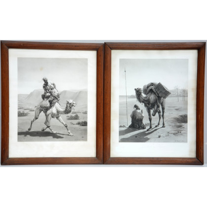 Coppia di acqueforti in bianco e nero a soggetti orientalisti (cm 70x60) In cornici in legno scanalate (difetti)