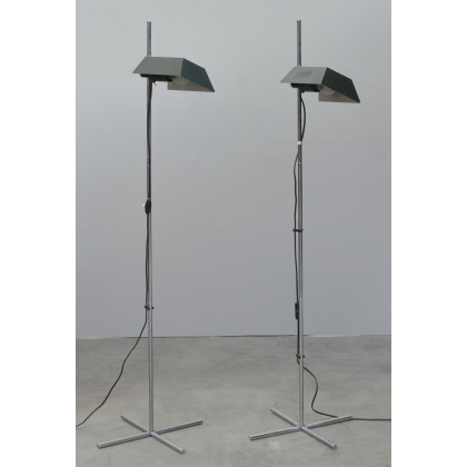 Coppia di lampade da terra a una luce con struttura in acciaio e paralume in alluminio laccato nero con reticolo verde, produzione Targetti (h cm 137) (lievi difetti)