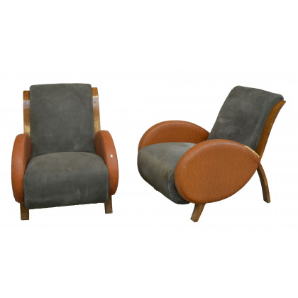 Coppia di poltrone imbottite in legno sagomato e rivestimento in Vipla. Italia anni 30. (h cm 80) (difetti)