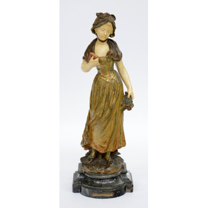 Arte dell'inizio del sec. XX. "Fanciulla con libro e fiori" Scultura in bronzo dorato con braccia e viso in avorio poggiante su base in marmo firmata: "H. Moreau" (h cm 41)