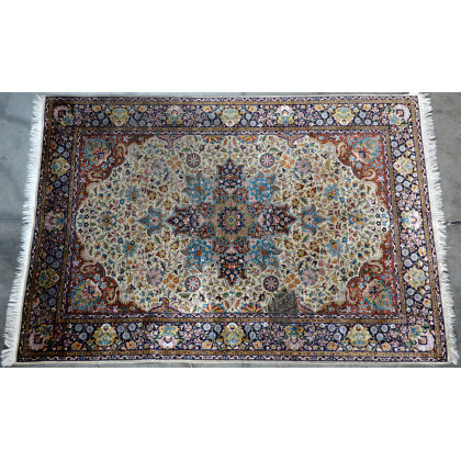 Tappeto Tabriz, decorato a motivi floreali e medaglione centrale nei toni del rosso, verde, blu, azzurro, rosa e beige (cm 217x155) (difetti)
