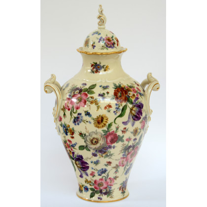 Manifattura tedesca, Vaso biansato con coperchio in porcellana decorato a fiori policromi su fondo crema