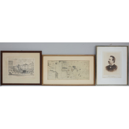 Lotto composto da un ritratto fotografico maschile, un'incisione raffigurante la "Fontana di piazza Colonna" e la riproduzione di una mappa, in cornici (difetti)