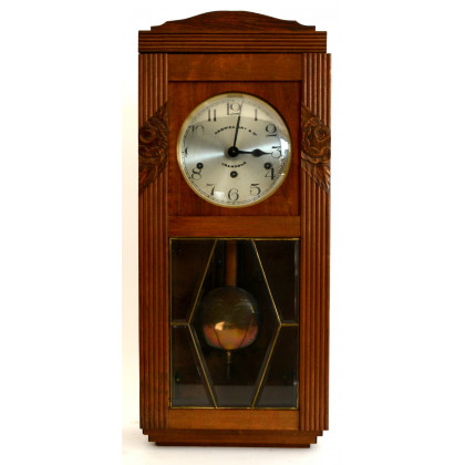 Pendola a muro con cassa in legno con montanti scanalati intagliati a fiori. Quadrante in metallo a numeri arabi marcato Gabriel Gay and Co, Grenoble (cm 70x30x16) (difetti)