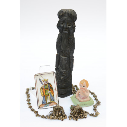 Lotto composto da una scultura in legno, una collana in metallo e due oggetti diversi in ceramica e porcellana