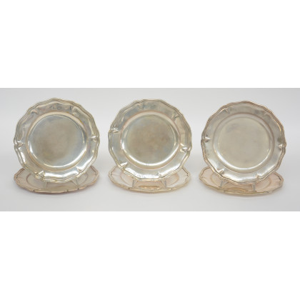 Sei piatti in argento di forma circolare con bordo sagomato. Italia, primi anni del '900 (d cm 20) (gr 1350 ca.) (lievi difetti)