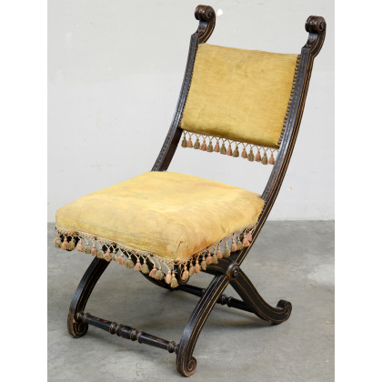 Sedia da camera con montanti intagliati e decorati a riccioli e motivi geometrici, gambe a lira, rivestita in velluto. Fine sec. XIX