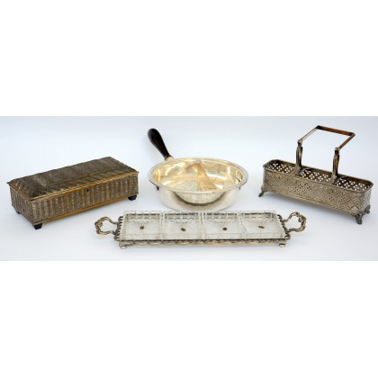 Lotto composto da quattro oggetti in metallo argentato e materiali diversi (difetti)