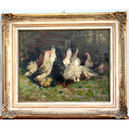"Galline". Olio su tela (cm 47x60) firmato in basso a sinistra, in cornice