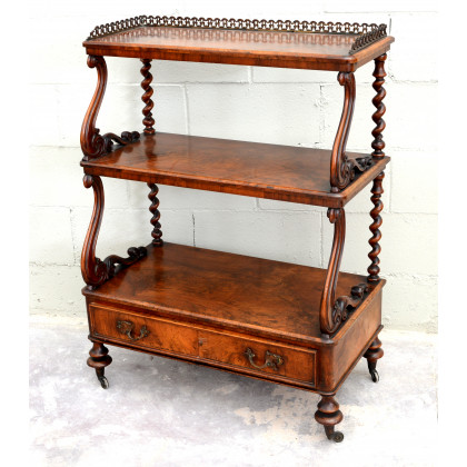 Etagère in noce e radica a tre ripiani a scalare, montanti anteriori sagomati e intagliati, posteriori a torciglione, un cassetto nella fascia, piedi torniti muniti di rotelle. Inghilterra, seconda metà sec. XIX (cm 77x103x40)