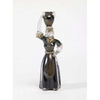 Manifattura di Seguso, Murano - figurina in vetro massello sommerso, iridato e con inclusioni di foglia d'oro, raffigurante una canefora, anni 40