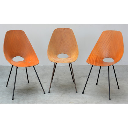 tre sedie modello "Medea". Produzione Fratelli Tagliabue, Italia 1955 ca. ferro verniciato nero, compensato curvato di teak. (cm 46x82x56) (lievi difetti)