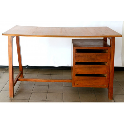 Scrivania a gambe dritte unite da traversa con tre cassetti nel montante. Italia, anni 40 (cm 130x78x69) (difetti)