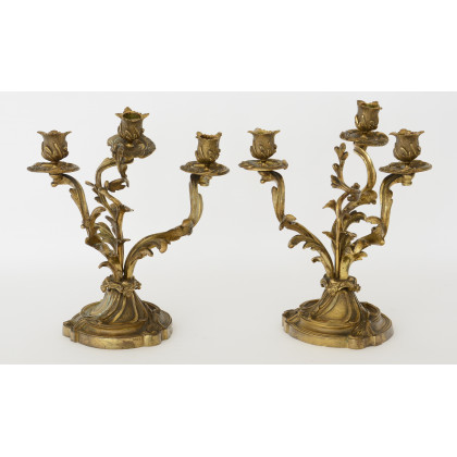 Coppia di candelieri a tre fiamme in bronzo con braccia decorati a rocaillles