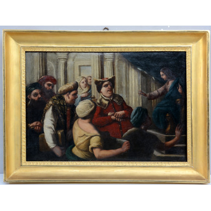 Scuola del sec. XVIII "Scena religiosa" olio su tela (cm 50x77) In cornice dorata del sec. XIX