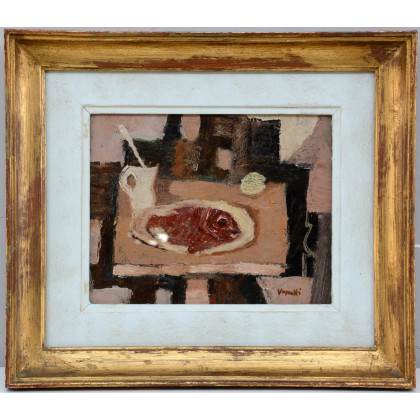 "Natura morta con pesche" olio su cartone (cm 20x24) firmato in basso a destra in cornice. Reca al verso etichetta della Galleria Ponte Rosso