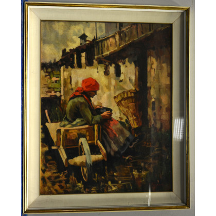 Firma indecifrata "Contadina a riposo" olio su tela (cm 74x58). Firmato in basso a destra. In cornice.