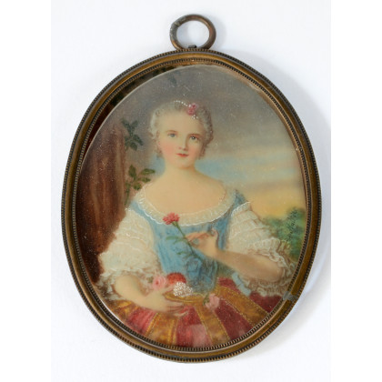 Firma indecifrata "Gentildonna con fiore" miniatura ovale firmata in basso a destra, in cornice