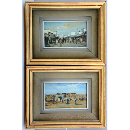 "Paesaggi orientali" due dipinti ad olio su compensato (cm 9.5x15) firmati in basso a destra, in cornici.