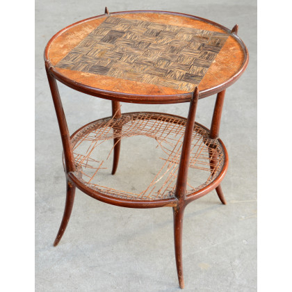 Tavolo da salotto con piano tondo decorato a scacchiera, montati sagomati riuniti da pianetto in vimini. Italia, anni 40 (cm 56x48) (difetti)