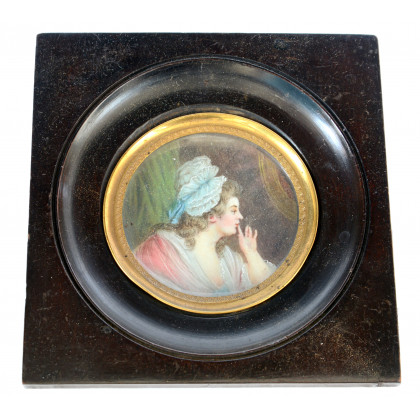 Firma indecifrata "Figura femminile" miniatura tonda firamta in basso a destra, in cornice