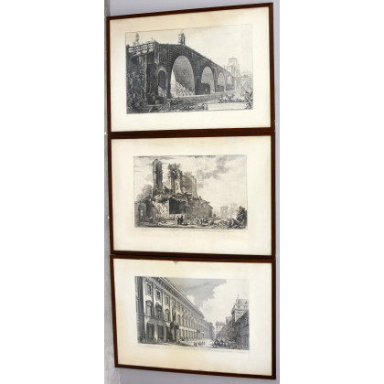 Gruppo di tre incisioni raffiguranti scorci con palazzi e rovine (foglio cm 60x85), tiratura tarda. In cornici (difetti)