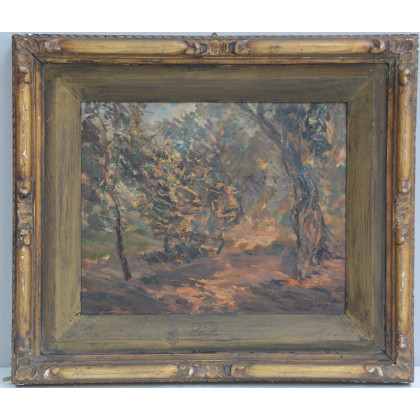 "Bosco di ulivi - Arma di Taggia", 1933, olio su tavoletta, (cm 28x35). Firmato in basso a destra. Firmato e titolato al retro. In cornice.