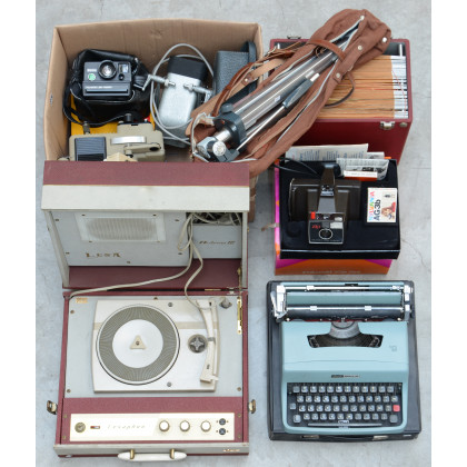 Lotto composto da una cinepresa Bolex 16 mm, un cavalletto cinematografico in alluminio marcato Susis, una macchina Fremen per montaggio di pellicole 8mm, un proiettore, un giradischi Lesa con contenitore per dischi, una macchina per scrivere Olivetti e altri oggetti di interesse cine-ottico (difetti)