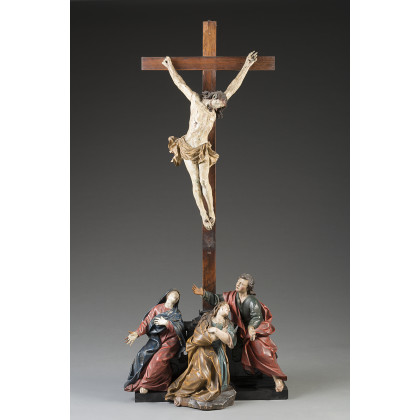 Arte napoletana del sec. XVII "La Crocifissione" composizione scultorea in legno laccato con Cristo, San Giovanni e le Pie donne (h cm 127) (difetti e mancanze) Neapolitan art of the 17th century. "Crucifixion" wooden figural group (defects and losses)