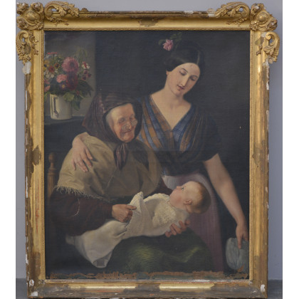 Scuola del XIX secolo "Mamma e nonna con bimbo" olio su tela (cm 116x96) In cornice dell'epoca (Difetti e mancanze)