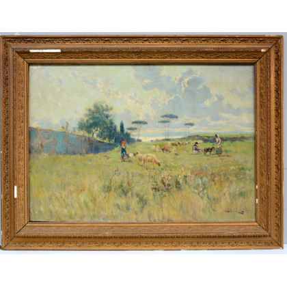 "Paesaggio con contadine e pecore", olio su tela (cm 70x100) firmato in basso a destra. In cornice