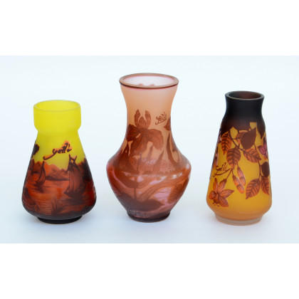 Lotto di tre vasetti acidati decorati a motivi floreali (lievi difetti)