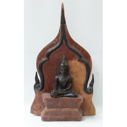 Manifattura orientale, scultura in legno raffigurante Buddha assiso entro struttura a tempio in legno sagomato policromo (cm 55x95x18) (difetti)