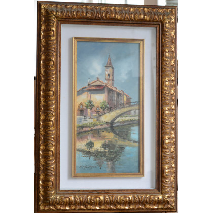 "Milano - San Cristoforo" olio su tela (cm 50x25) firmato in basso a destra. Autentica autografa e titolo al retro, allegato certificato di garanzia della Galleria d'arte Massante, in cornice