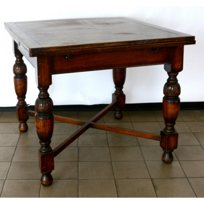Tavolo allungabile con gambe intagliate a motivi vegetali riunite da traversa (cm 87x77x87)