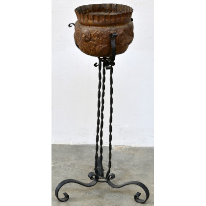 Vaso portafiori in rame sbalzato con trespolo in ferro battuto (h. cm 90)