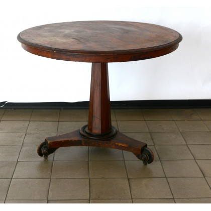 Tavolo a vela con piano di forma tonda, gamba sfaccettata terminante con tre piedi muniti di rotelle