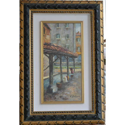 "Milano - Vicolo lavandai" olio su tela (cm 50x25) firmato in basso a destra Autentica autografa e titolo al retro, allegato certificato di garanzia della Galleria d'arte Massante, in cornice