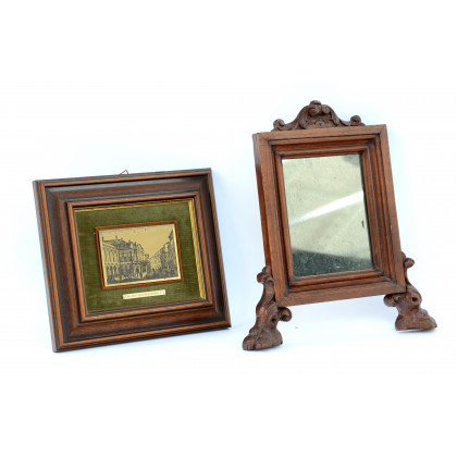 Lotto composto da una piccola specchierina e una lasra in metallo raffigurante La Scala di Milano, in cornice