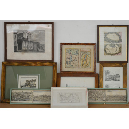 Lotto composto da nove tra incisioni ed acquaforti, epoche e misure diverse, raffiguranti carte geografiche e paesaggi, in cornici (difetti)