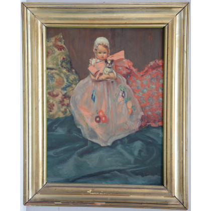 "Bimba con cuffia e cagnolino" olio su cartoncino pressato (cm 70x50) firmato e datato in basso a destra. In cornice (difetti)