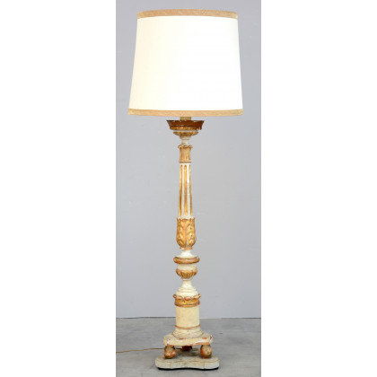 Candeliere in legno laccato e dorato con fusto tornito e scanalato intagliato a motivi vegetali. Sec. XIX (montato a luce elettrica in epoca posteriore)(difetti)