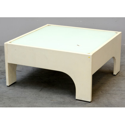 Tavolo basso della serie "Oriolo". Produzione Sormani, Milano, 1963. Legno laccato bianco e vetro retro-verniciato bianco. (cm 83x42x83) (difetti)