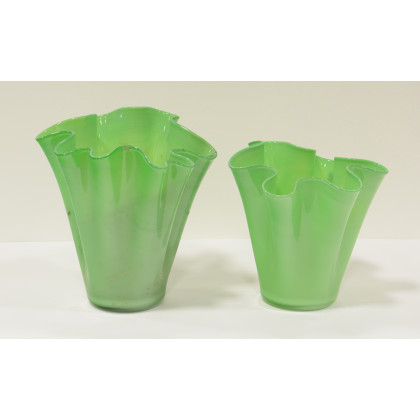Lotto composto da due vasi a fazzoletto in vetro verde, misure diverse