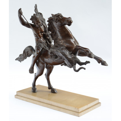 Ignoto sec. XX "Cacciatore a cavallo" scultura in bronzo brunito (h. cm 50) poggiante su base in marmo