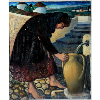 Firma indecifrata "Alla Fonte" olio su tela (cm 120x100) Firmato e datato in basso a destra.