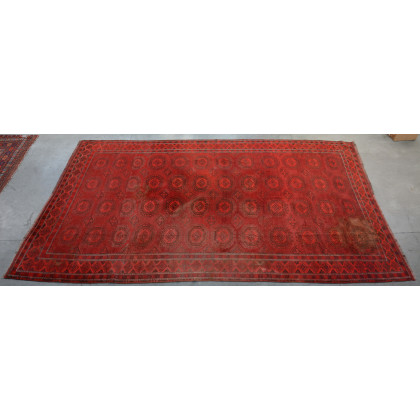 Tappeto Afghan, Turkestan occidentale secolo XX. Disegno a Gul nei toni del marrone su fondo rosso (cm 553x336)(gravi difetti)