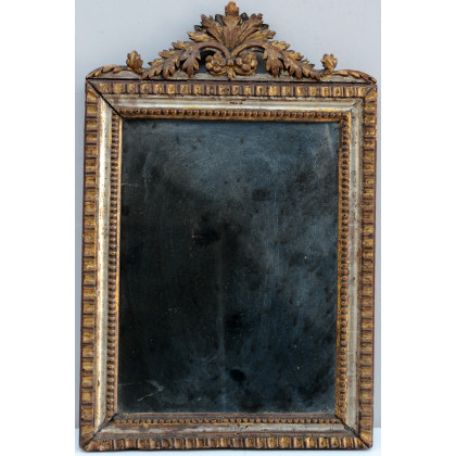 Specchiera rettangolare in legno intagliato, dorato e meccato con cimasa sagomata, decorata a motivi vegetali (cm 67x42)