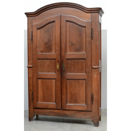 Armadio di forma sagomata in noce a due ante riquadrate sul fronte, piedi mossi. Piemonte Sec. XVIII (cm 150x240x52)